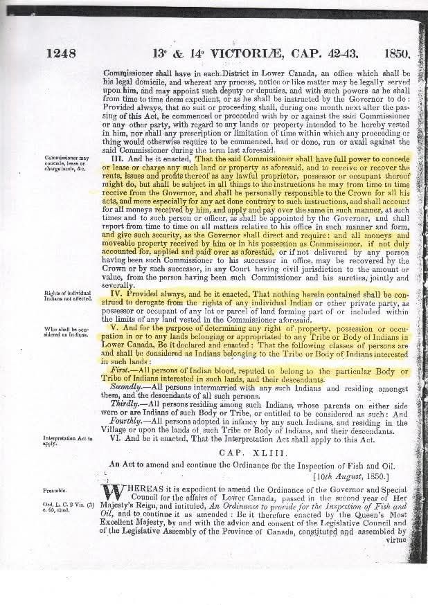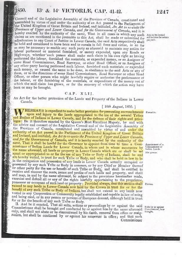 La Loi de 1850 pour une meilleure protection des terres et des biens des Indiens du Bas-Canada a également nommé un «commissaire» et désigné les terres comme détenues en fiducie par la Couronne et limitant aussi les droits des «Indiens».